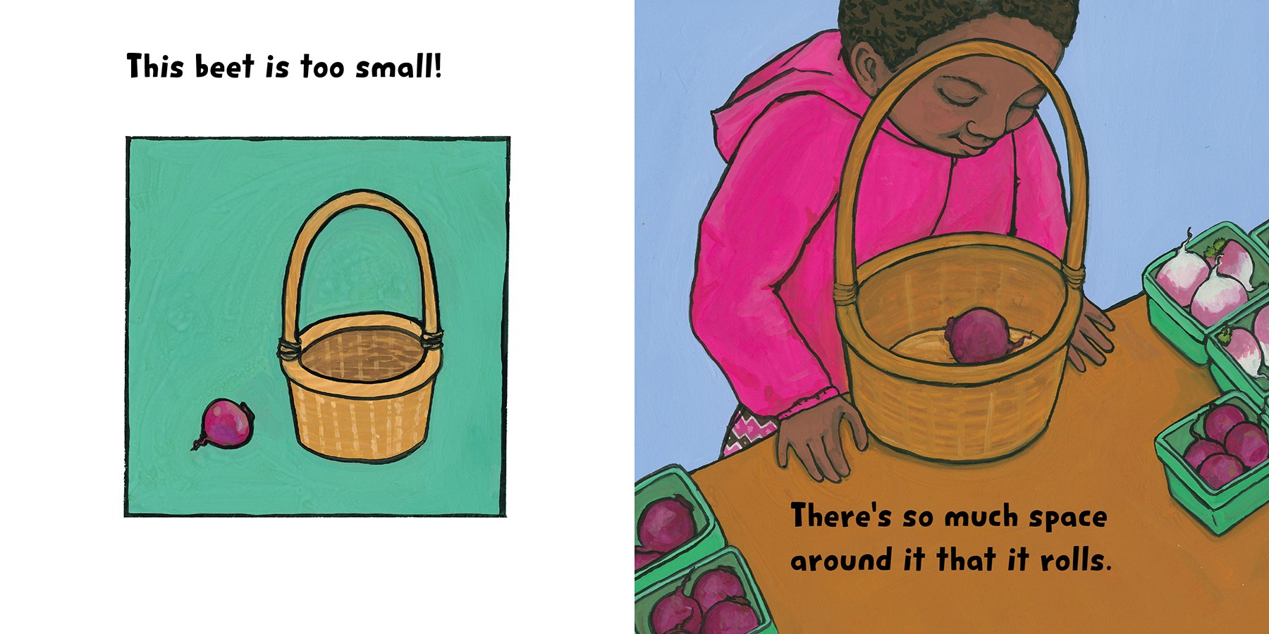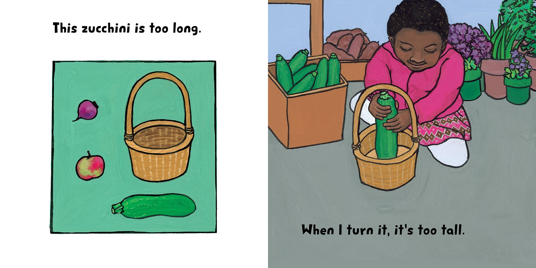 Take a trip to the farmers' market in this playful story about spatial sense. Olivia is searching for something just the right size to fill her basket. The apple is so small that it rolls around. The zucchini is so long that it sticks out. What will fit just right?