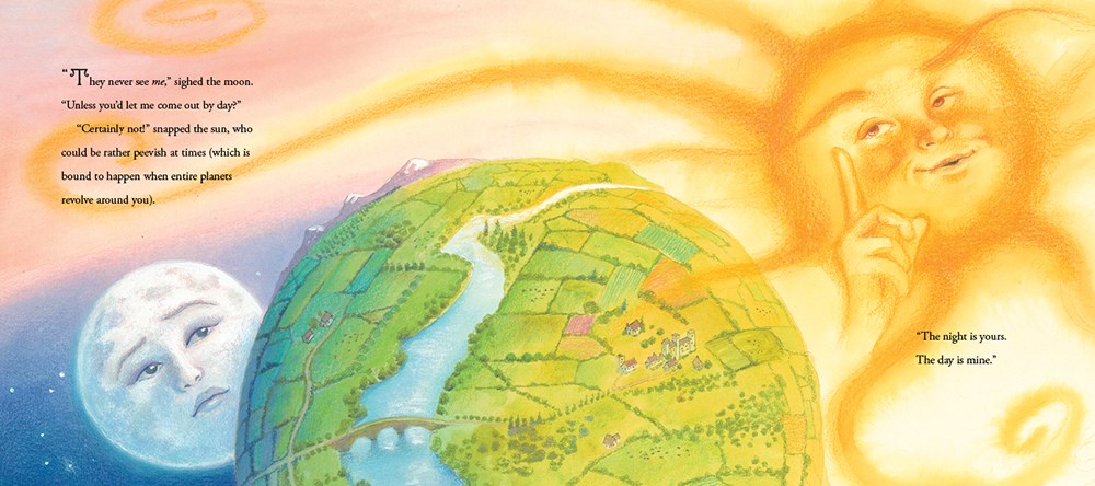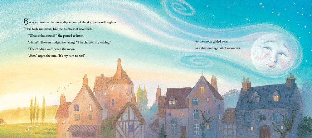 There once was a time when the sun alone ruled the day, the moon graced the night, and little children were sent to bed before sunset. Then early one dawn, the moon heard sounds of children laughing, and she yearned to see them by daylight.