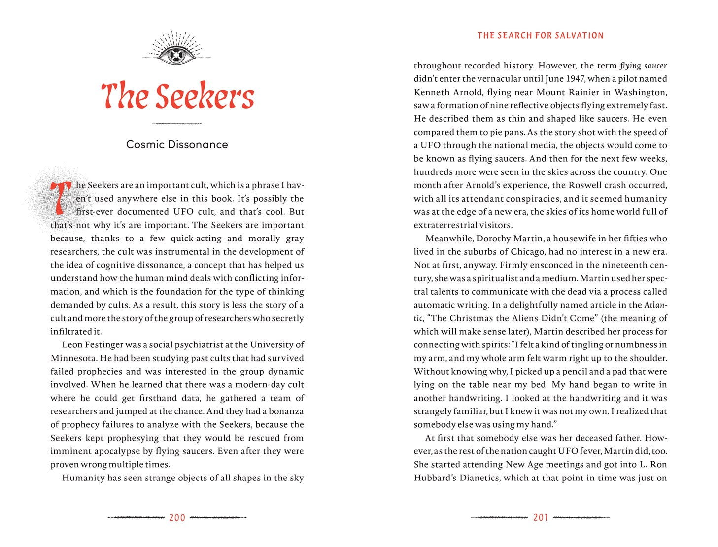 - The Seekers: The infiltration and study of this, the earliest known UFO cult, by psychologists inspired the term cognitive dissonance.