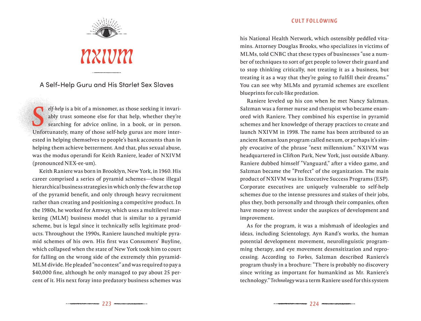 - NXIVM: This twenty-first-century cult attracted several Hollywood actresses and engaged in sex trafficking, forced labor, and racketeering under the guise of personal development seminars.