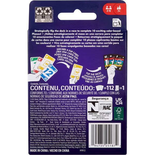 From the makers of UNO card game, Phase 10 Flip turns the classic Phase 10 card game on its head! Players still race to complete 10 Phases, but with some unexpected twists—like a double-sided deck and special FLIP cards! One side of the deck features cards with standard colors, but the other side is ALL WILD! Because the Phases in this game require runs of the same color, players must strategically flip the deck to the Wild Side to help complete their Phases more quickly, or flip back to the Color Side to hinder their opponents. This fun family card game is perfect for 7 year olds and up. Colors and decorations may vary.