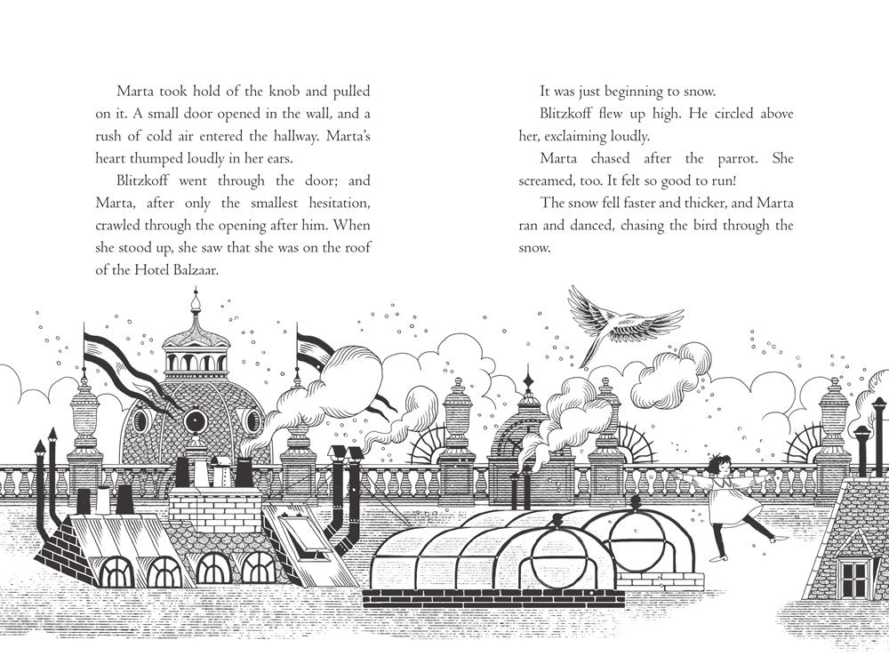 At the Hotel Balzaar, Marta’s mother rises before the sun, puts on her uniform, and instructs Marta to roam as she will but quietly, invisibly—like a little mouse. While her mother cleans rooms, Marta slips down the back staircase to the grand lobby to chat with the bellman, study the painting of an angel’s wing over the fireplace, and watch a cat chase a mouse around the face of the grandfather clock, all the while dreaming of the return of her soldier father, who has gone missing. One day, a mysterious countess with a parrot checks in, promising a story—in fact, seven stories in all, each to be told in its proper order. As the stories unfold, Marta begins to wonder: could the secret to her father’s disappearance lie in the countess’s tales? Book two in a trio of novellas bound by place and mood—with elegant line art by Júlia Sardà—The Hotel Balzaar masterfully juggles yearning and belief, shining light into every dark corner.