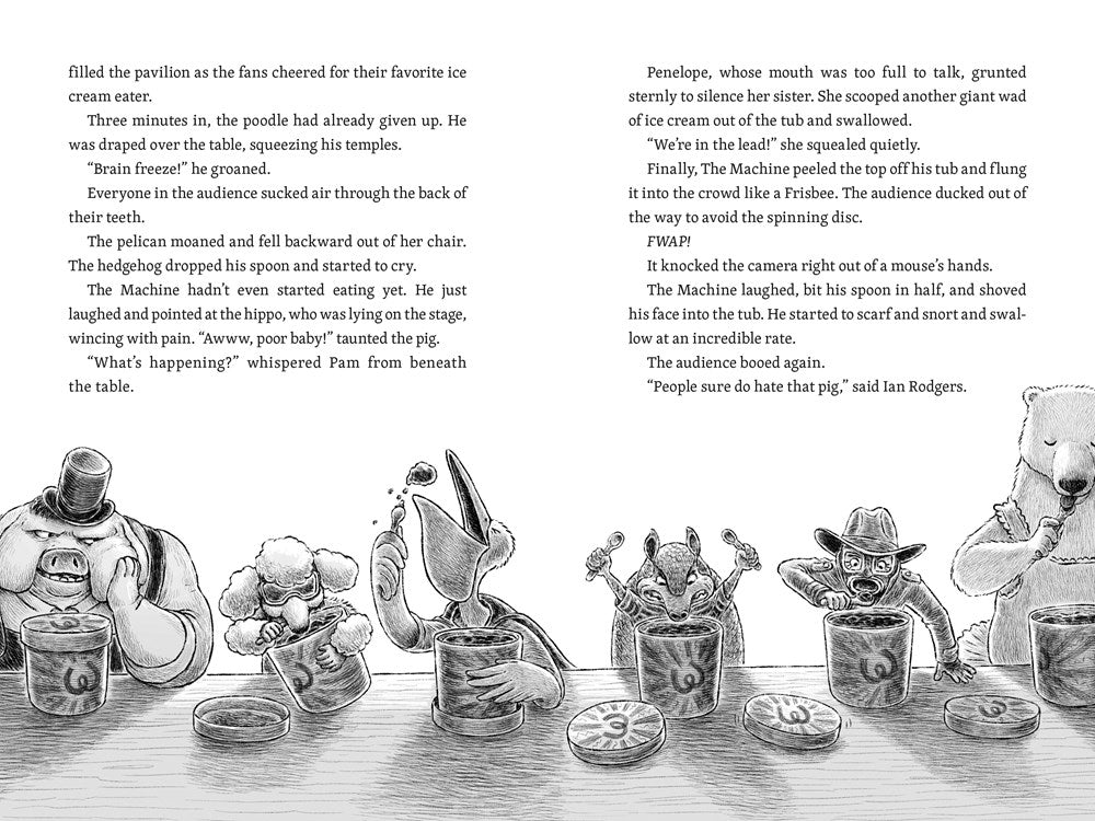 Reader, be advised that the events in this book may tickle your funny bone: A boy and his robot nanny travel the globe in search of the world’s tastiest treat. A girl and her sister compete in an ice cream eating contest—against an honest-to-goodness pig. A child prodigy invents a new way to create the freshest dessert ever. And we should probably mention the evil ice cream seller terrorizing local kids; the sorcerer’s assistant who must conjure icy cream out of thin air for the king, or else; and the sole human subject stuck on a giant alien space lab, who longs for the taste of home.
