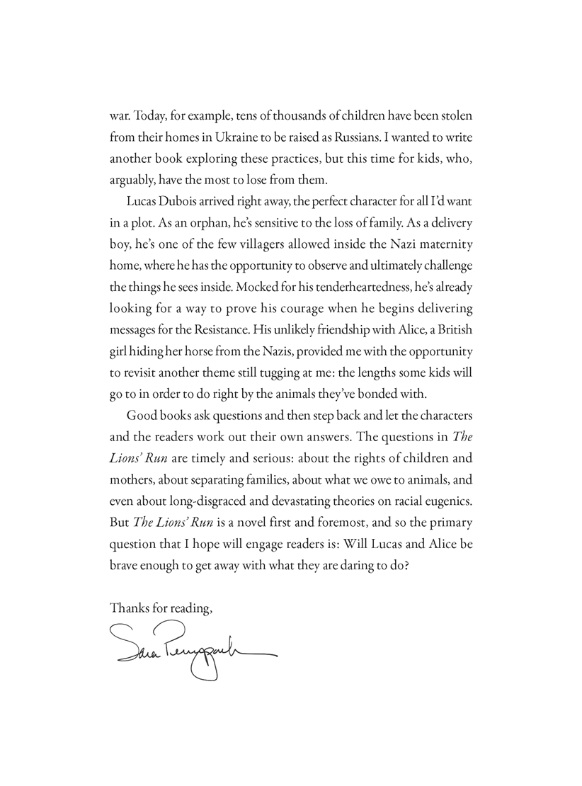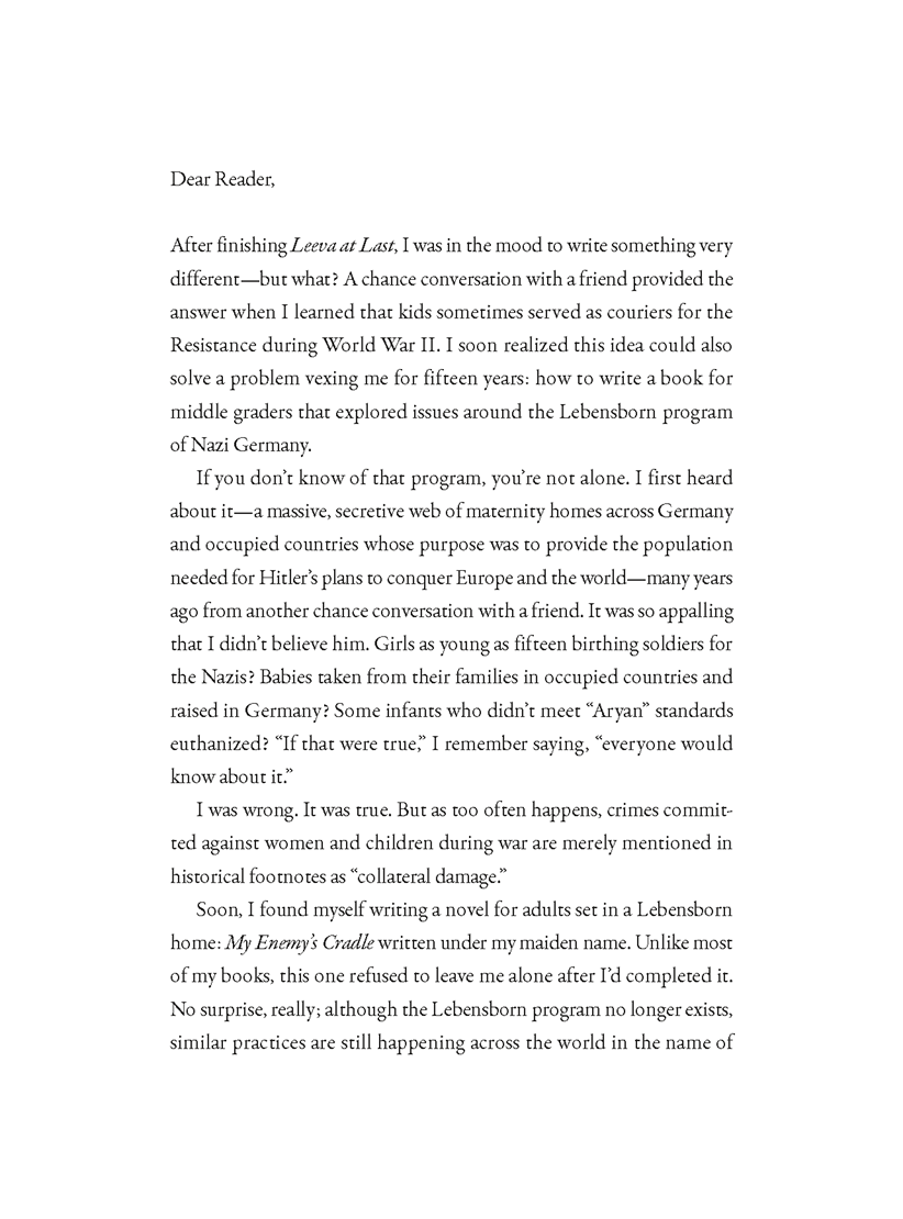 As the two fall into a tentative alliance, Lucas begins to realize they are not the only ones in the village with secrets. The housekeeper at the German maternity home and a priest at the orphanage pass coded messages under the noses of the occupiers; a neighbor in town may be hiding a Jewish family; and a young mother at the home makes dangerous plans to keep her baby from the Germans. Emboldened by the unlikely resisters all around him – and rumors of an Allied forces invasion – Lucas must decide how much he is willing to risk to make the most courageous rescue of all.