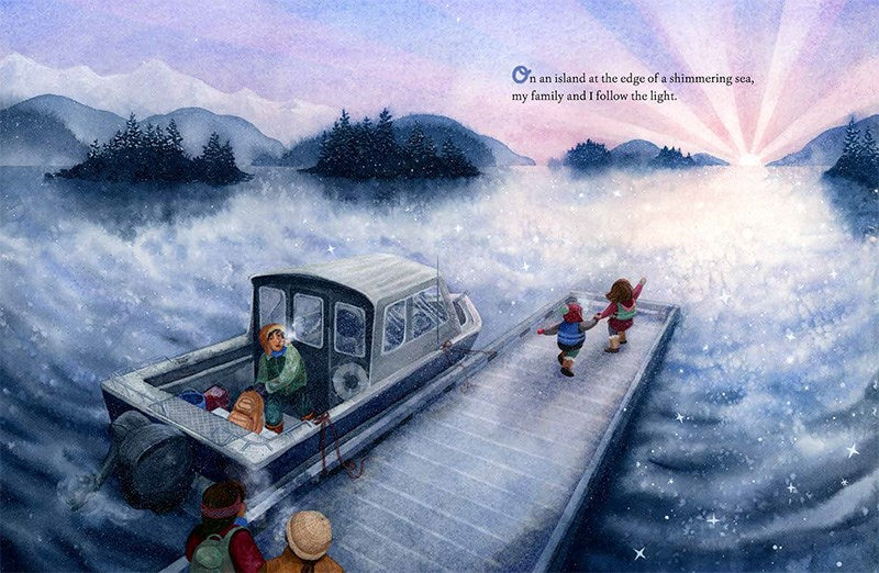 On an island at the edge of a silvery sea, when the moon rises and night falls, a girl spins a story for her worried cousin to help him find comfort in the wintery dark. She invites him to see moonlight glittering in the forest, bioluminescence sparkling by the shore, and northern lights blazing in the sky. In the dark of the night, the whole world sings.