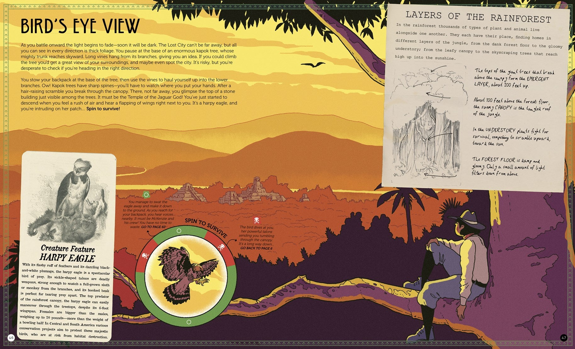 From bestselling author Emily Hawkins and with spectacular artwork by R. Fresson, children aged 7+ will love playing through this unique choose-your-own-adventure book again and again. Filled with fascinating non-fiction content and with all manner of outcomes awaiting you, Spin to Survive: Deadly Jungle is both a gorgeous reference book and an endlessly replayable adventure.