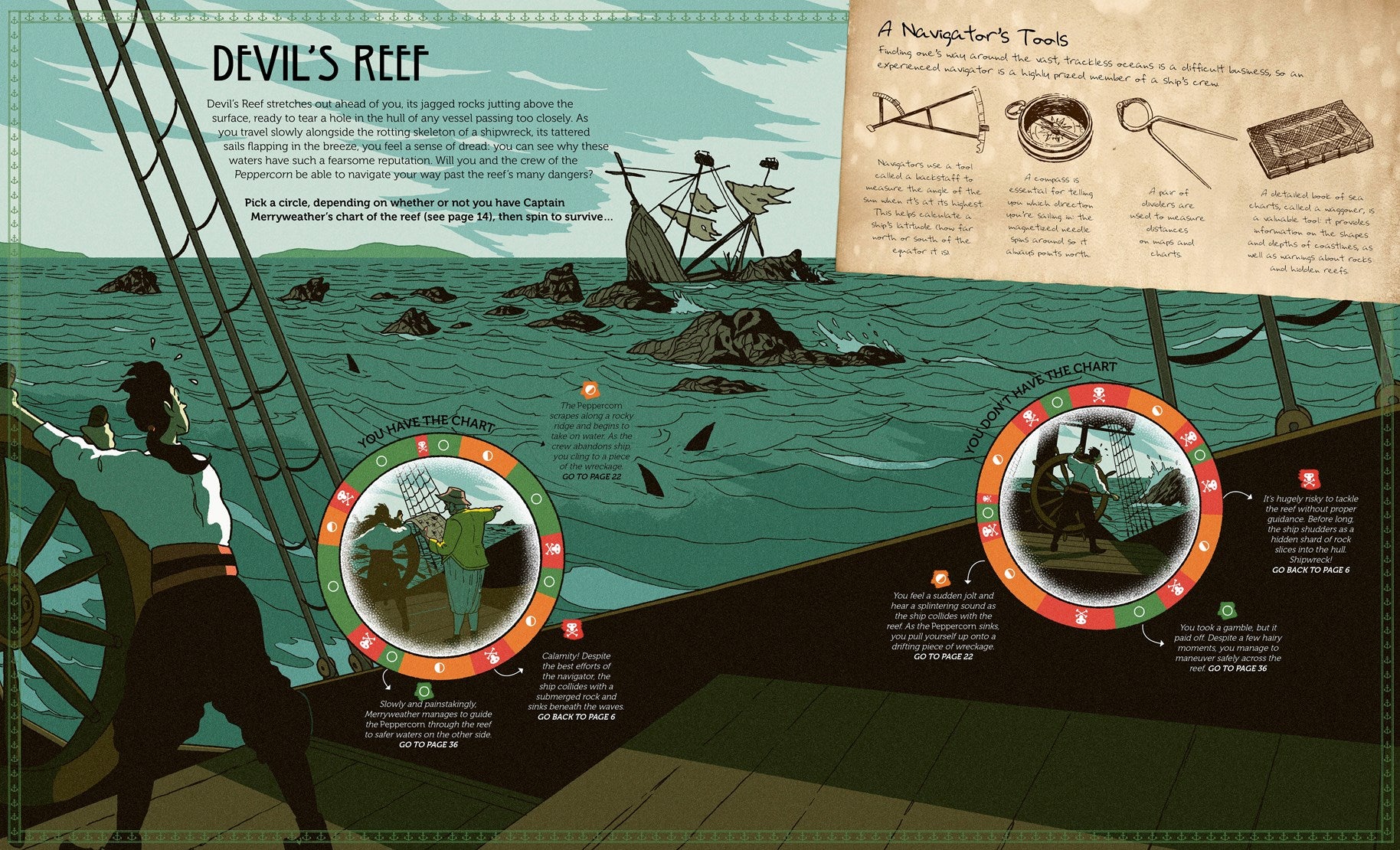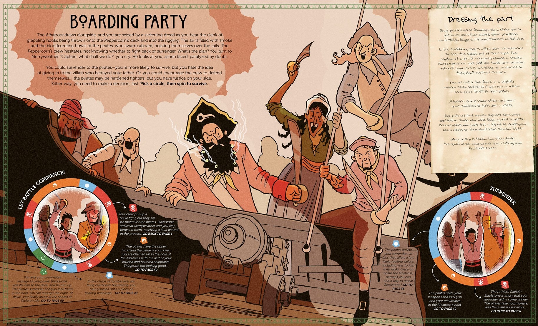 With your trusty Survival Spinner (included), make your choice and spin to survive. Flip back and forth through the book as you play through a new adventure with every read, where each scenario might lead to certain death, fame and fortune, or any number of unexpected surprises. On every page, explore a lawless world where ruthless colonizers clash with oceanic outlaws and loyalty is bought for a few pieces of eight. Discover tips for surviving at sea, and put the story in context with historical facts and illustrations.