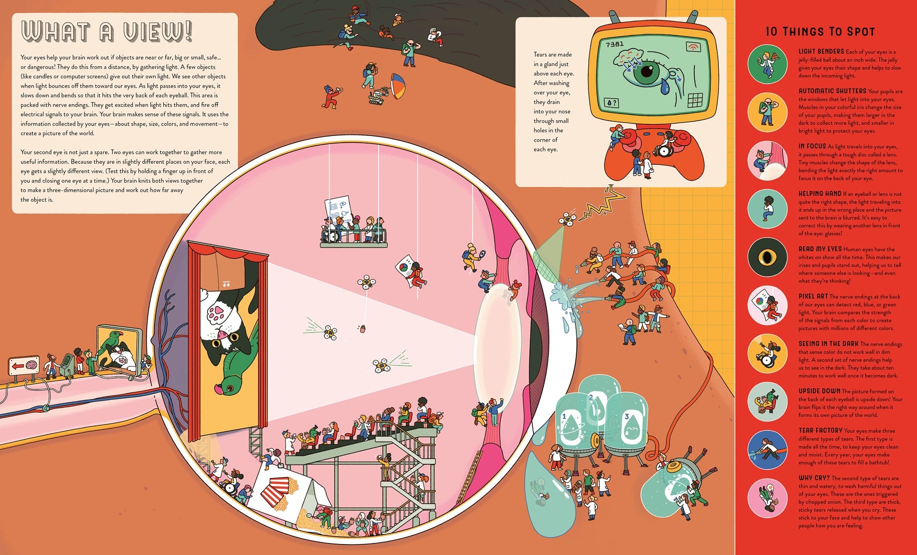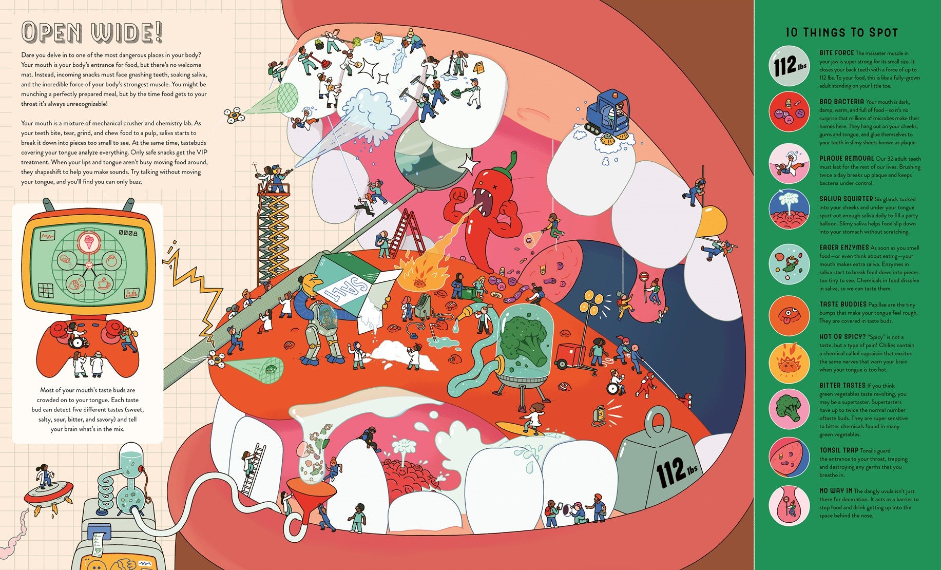 But it's not all a biology lesson: look closely through the magnifying glass, and you'll find scared scientists fleeing from a tastebud-tingling chili pepper, an ear-canal waterslide, and even a theater inside an eyeball! Your trusty magnifying glass will reveal new gags again and again among the scrapes, mishaps and wacky experiments of the miniature scientists, where every tiny detail tells a story, and every story reveals more incredible facts about the human body.