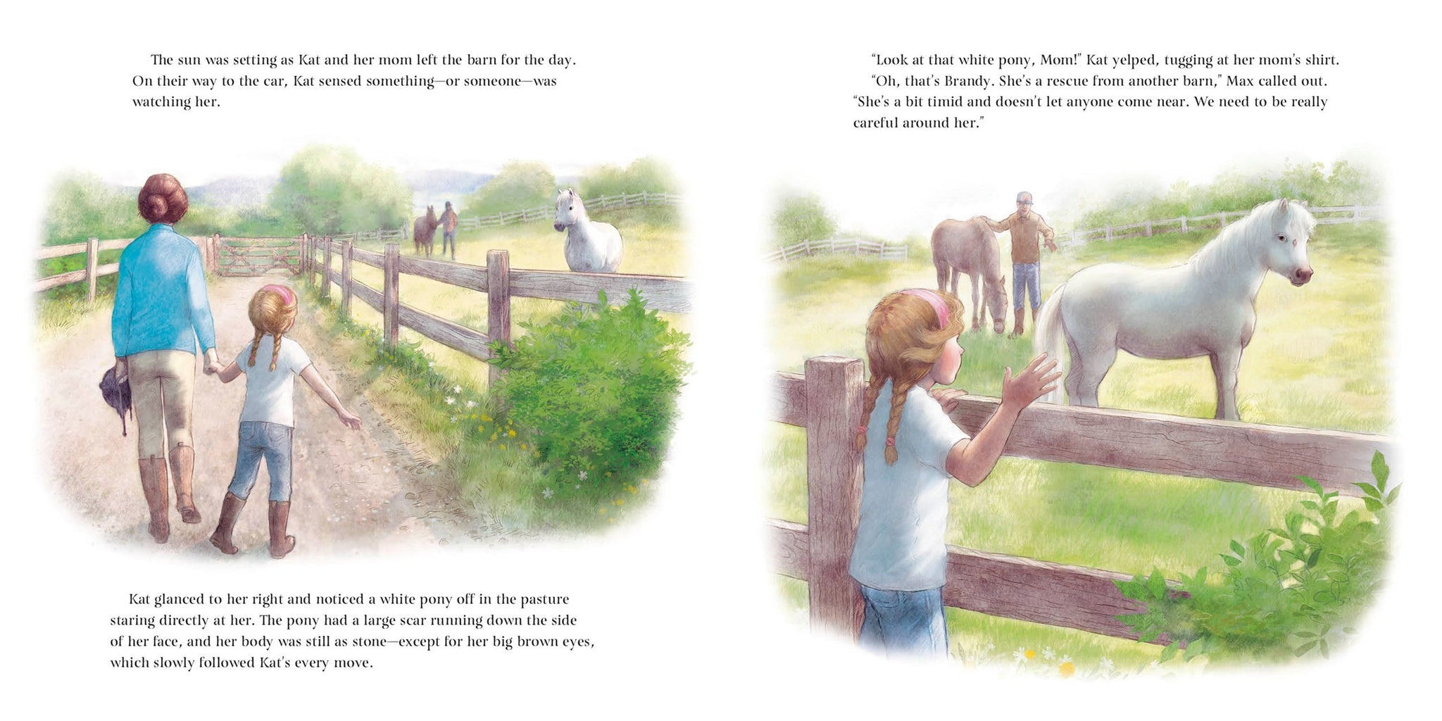Brandy is a rescue horse with a past that makes it hard for her to trust others. From the moment Kat first sees Brandy in the pasture from afar, with her pretty white coat and the unique little scar on her face, she wants to learn the horse’s story. Kat sees herself in Brandy and is intrigued, eager to get to know her better. Through patience and curiosity, Kat works through her worries and builds up the courage to get back in the saddle and ride again.