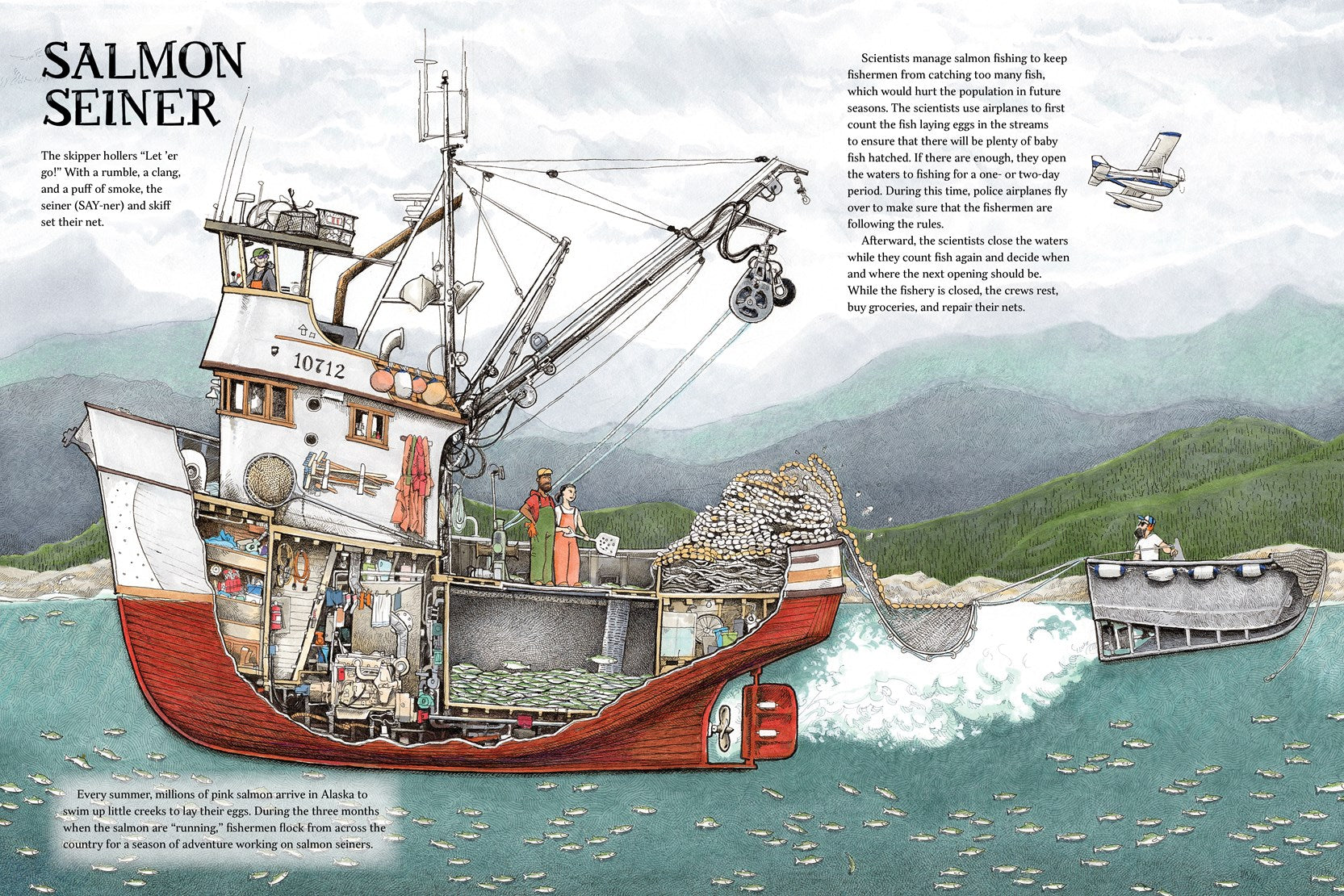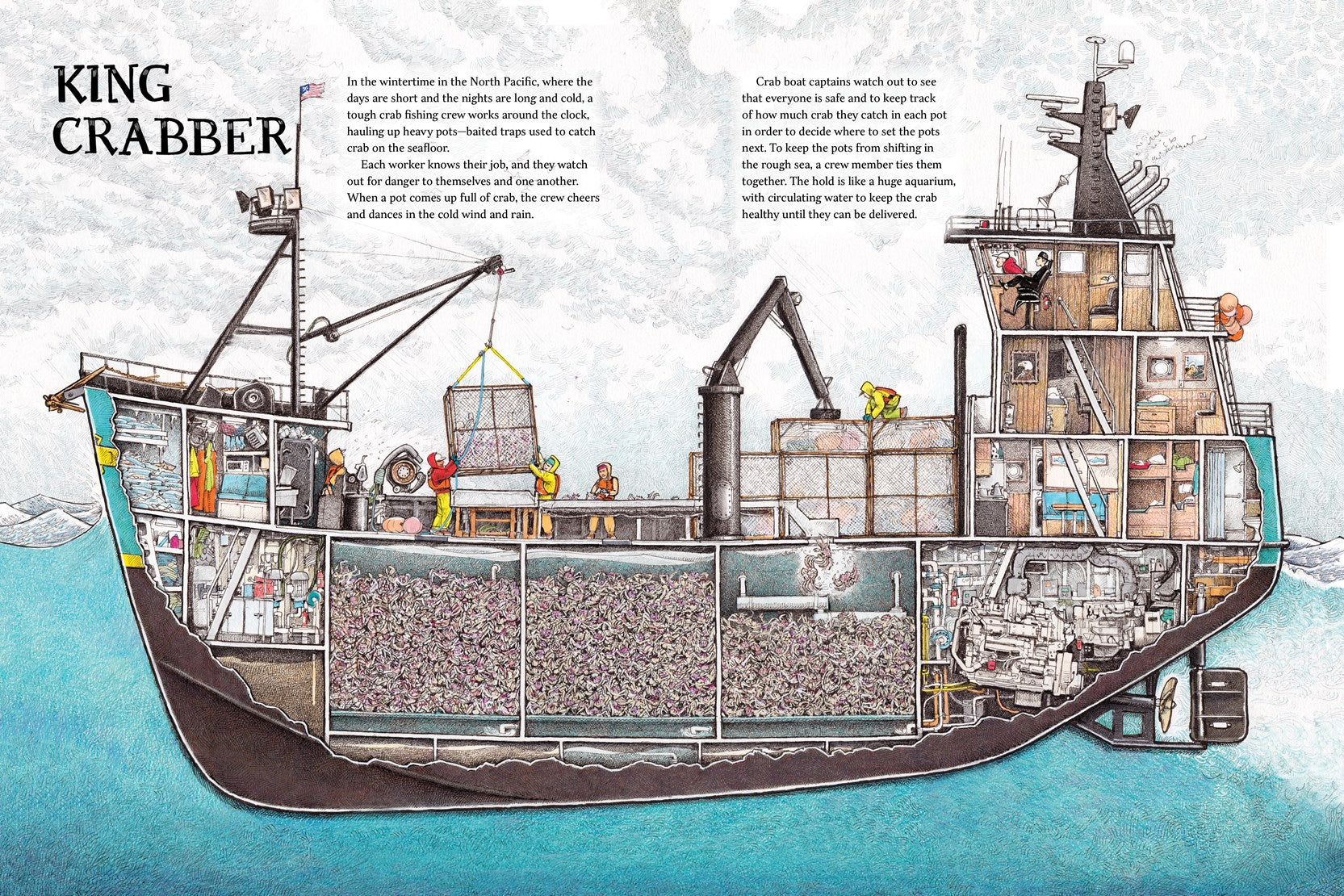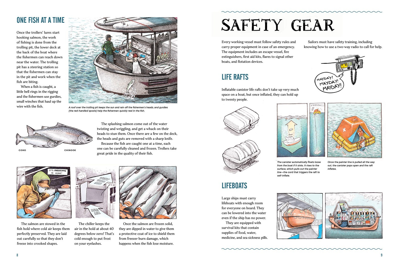 Want to know what goes on behind the scenes of a Coast Guard rescue, what it's like to work on a science research vessel, or what's involved in crabbing? The book includes illustrated details about each boat's mission and jobs people do on board, as well as a glimpse of what life is like on a working boat.