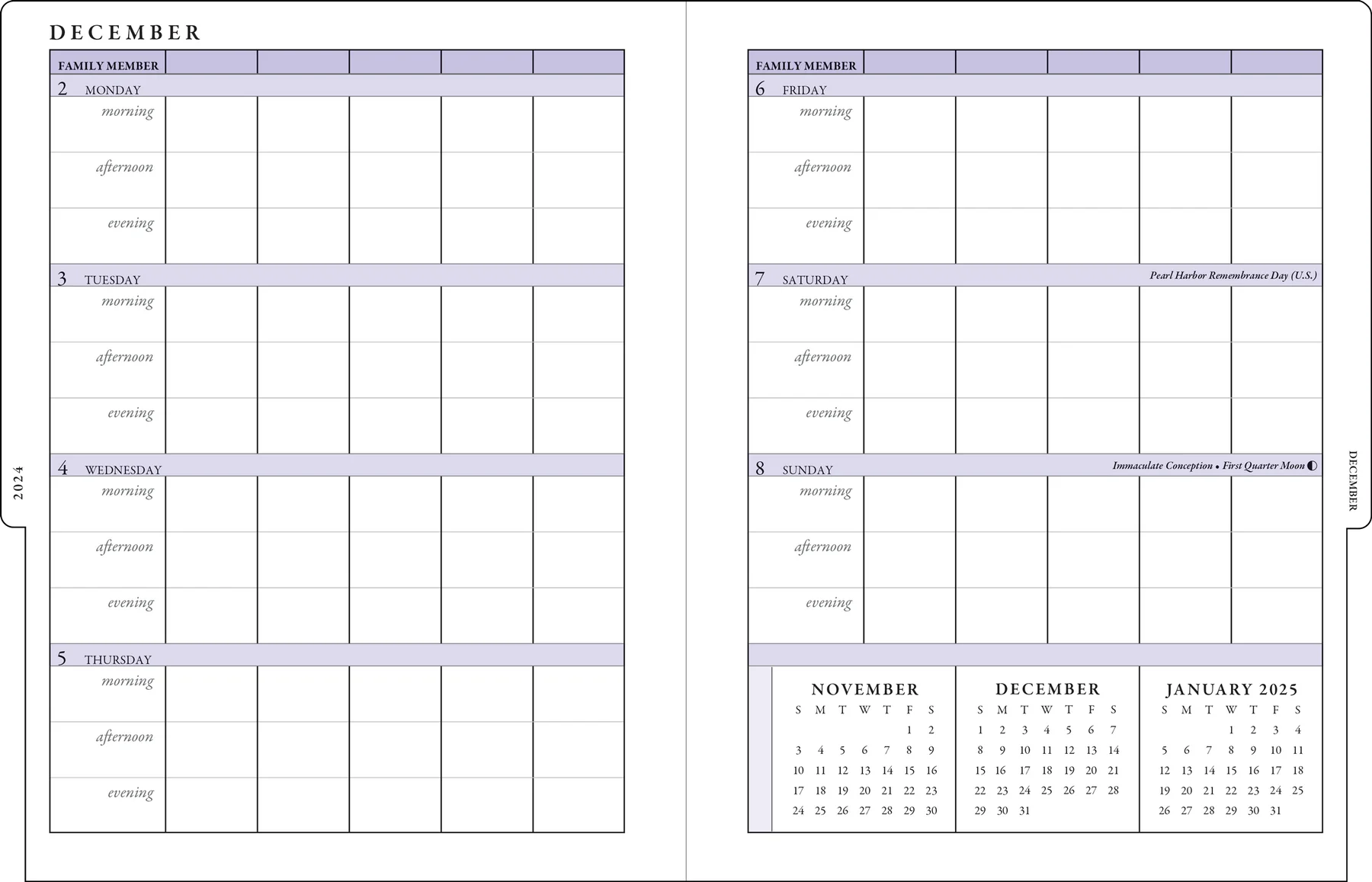 • Each 2-page spread displays your weekly master plan, with 5 columns: One column for each of 5 family members.