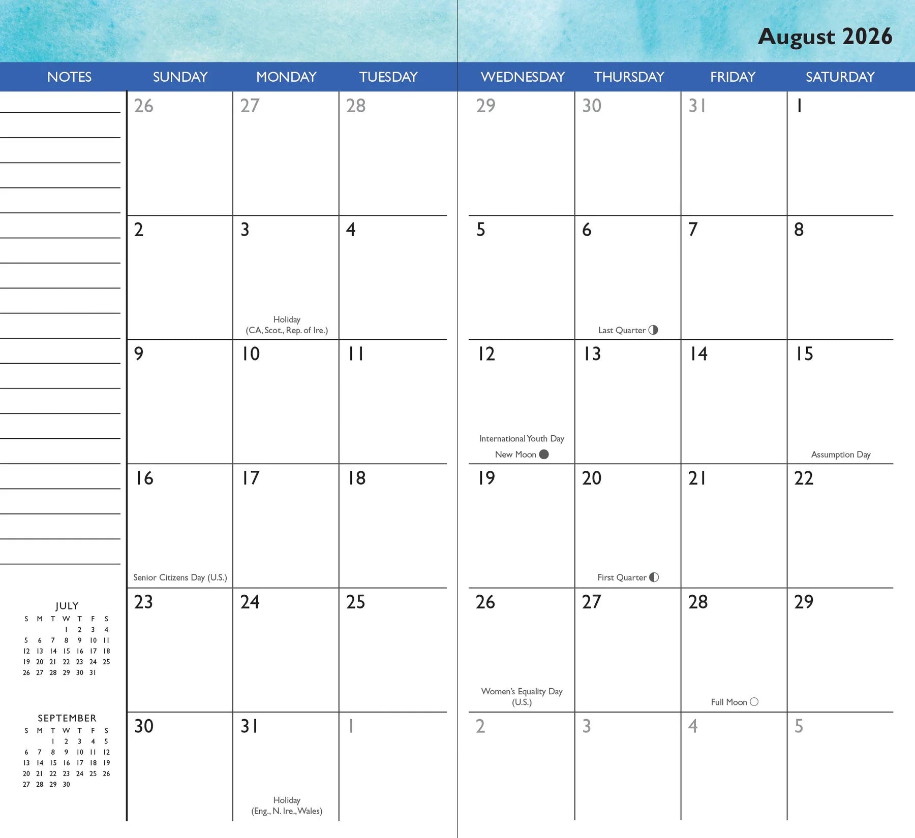 - Each spread features 1 month, past and future month calendar references, and ruled notes spaces.