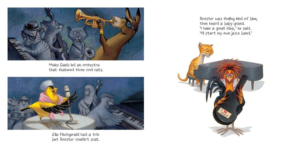 When a jazz-loving rooster sets his sights on winning a barnyard talent show, he realizes he can't do it as a solo act. He's up against the talents of Mules Davis's cool duo and Ella Finchgerald's singing group. Acoustic Rooster calls on friends like pianist Duck Ellington, singer Bee Holiday, and percussionist piggy Pepe Ernesto Cruz. Together, the foursome makes beautiful music as they rock the barnyard. And while they may not win first prize, Acoustic Rooster realizes he has the world's best jazz band and that's all that matters. Colorful artwork from artist Tim Bowers (Memoirs of a Goldfish) ensures this story doesn't miss a beat. A glossary of musical terms and instruments rounds out this perfect introduction to jazz for young readers.