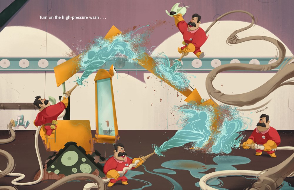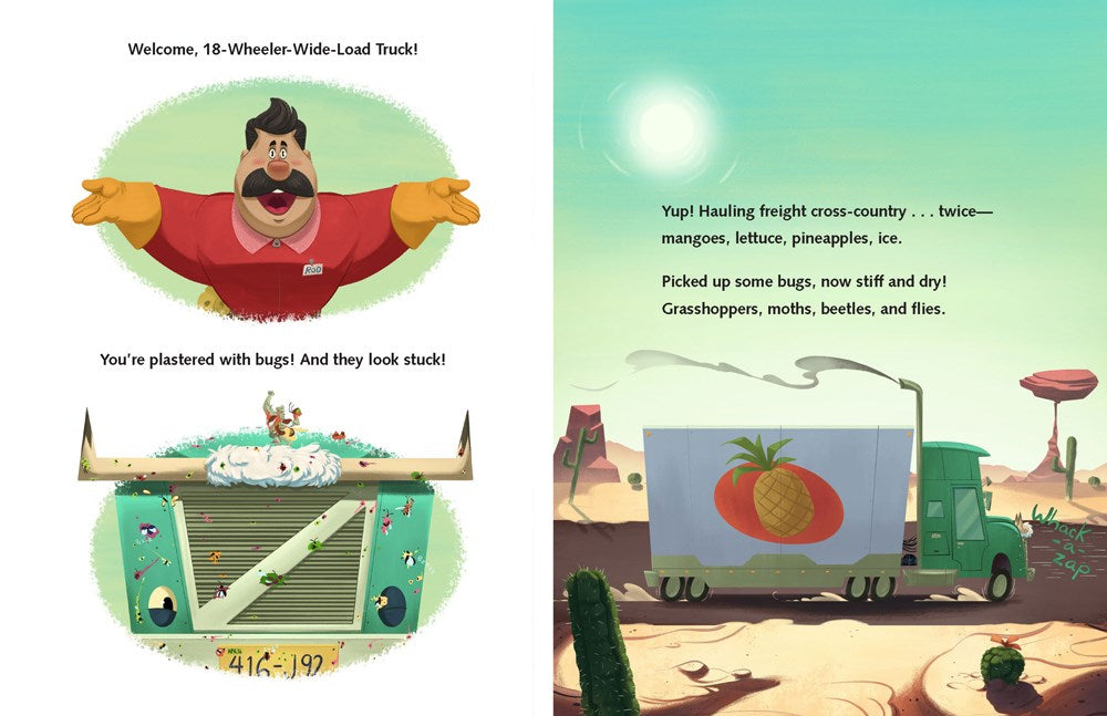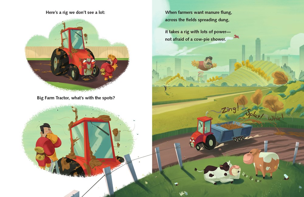 With rhythm, rhyme, and onomatopoeia, the text is fun to read aloud. And each truck is depicted with expressive headlight eyes and a personality of its own. In creating the character of the truck wash manager, the illustrator portrayed his dad, who owned a truck and often recruited his son to help wash it.