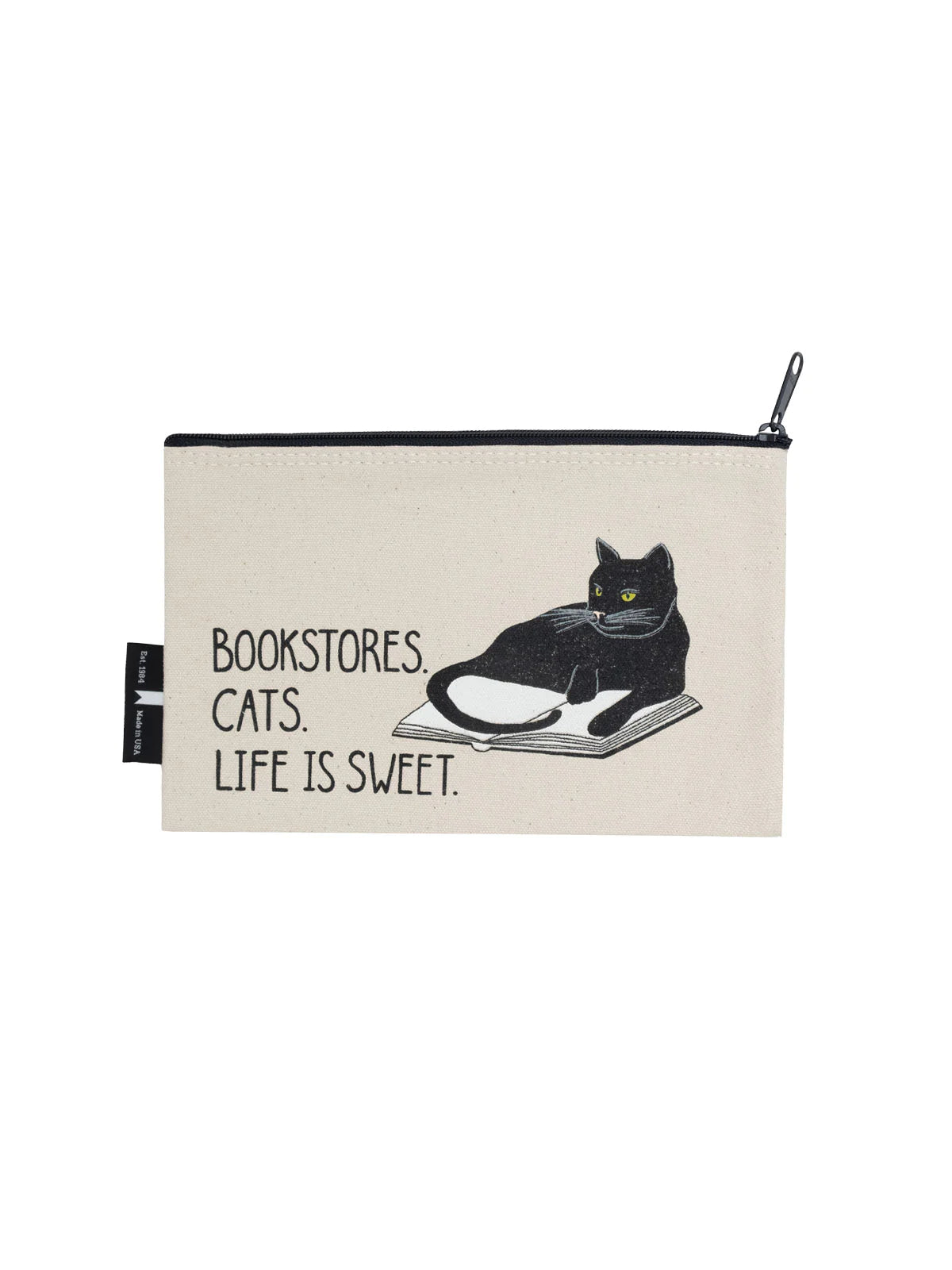 "Bookstores. Cats. Life is sweet." cotton canvas pouch.