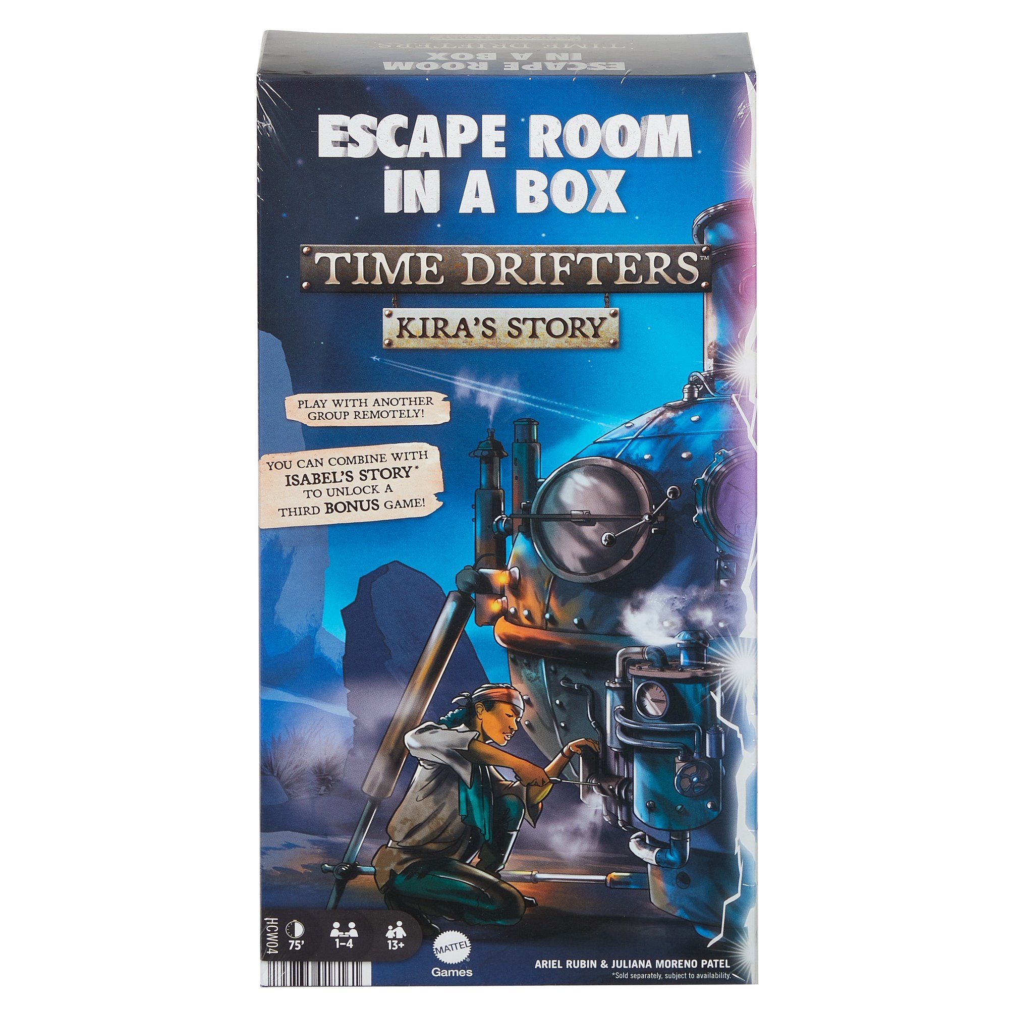 The Time Drifters two-part series of Escape Room in a Box games is a thrilling puzzle-solving hunt with a twist: finishing both games unlocks a bonus 60-minute game that can be played remotely! The story is this: Isabel and Kira are time traveling adventurers. When a rip in the space-time continuum opened, their time machine ripped in half, trapping them in different locations and points in time. Now, players must work on their own or with up to 4 players to gather clues and solve the puzzle box. Once Kira's Story and Isabel's Story (each sold separately) are completely solved, a third extra game is unlocked with more time travel mysteries! The third game can be played remotely using an online videoconferencing system. This exciting board game brings big, curious fun to any game night and makes the perfect gift for puzzle-solving enthusiasts ages 13 and older. Colors and decorations may vary. You can purchase Isabel's Story, sold separately, to fully unlock the bonus game.