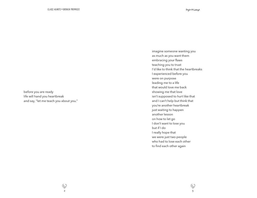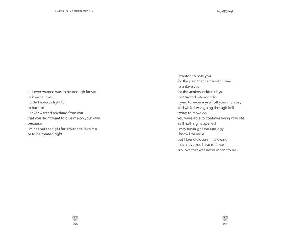 Poet Kayla McCullough’s Glass Hearts & Broken Promises is a collection of poetry and prose reflecting on heartbreak, self-love, and unfiltered emotions. Divided into two parts—The Break and The Mend—Kayla gently guides readers through the journey of heartache and reminds them to embrace the love from within. An inspired debut from a talented new voice, Glass Hearts & Broken Promises is the best friend you need when it’s time to heal the broken pieces.