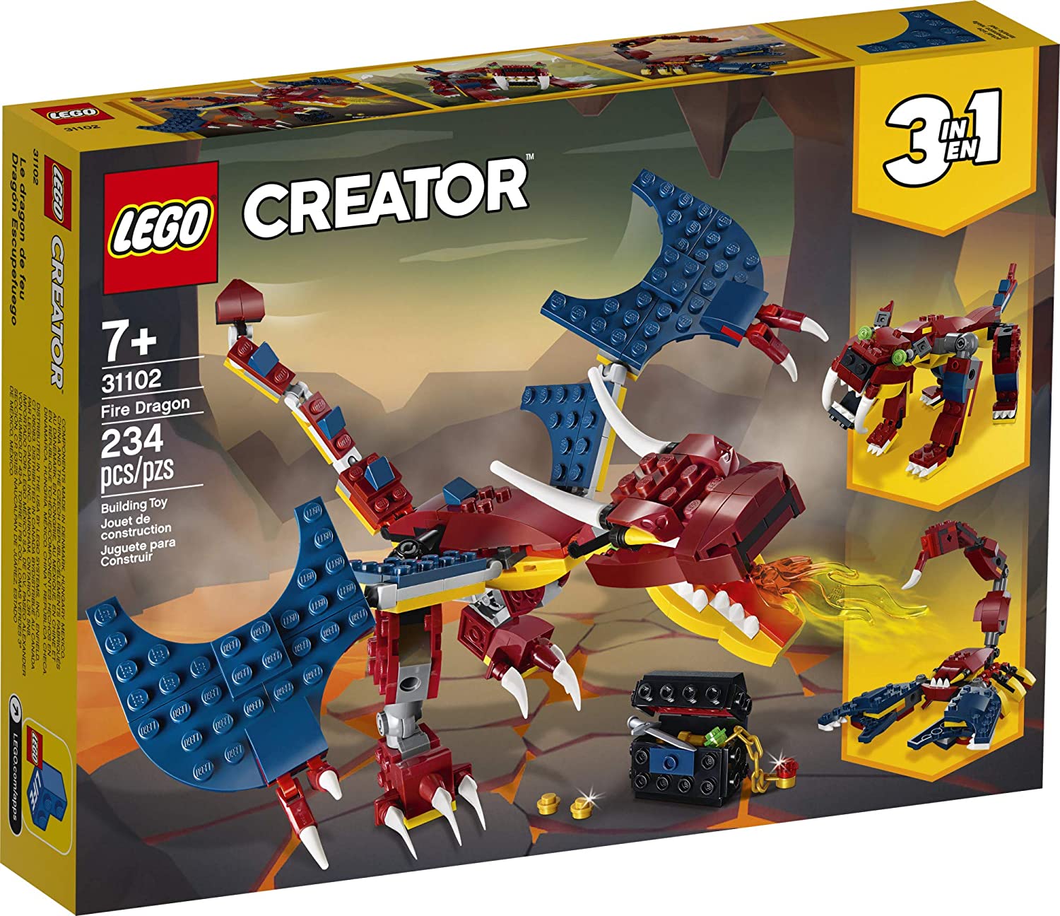 - Support kids’ imaginative role play with this exciting LEGO Creator 3-in-1 set featuring a fire dragon, a saber-toothed tiger and a scorpion!