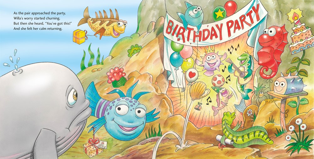 On his way to a party, Mr. Fish bumps into his friend Willa Whale, who is frozen in worry. What if no one wants to talk to her? What if she forgets the words to the birthday song? Using simple steps, Mr. Fish teaches Willa how to breathe and make a plan whenever her worries start bubbling up. After all, worry isn’t bigger than a whale!