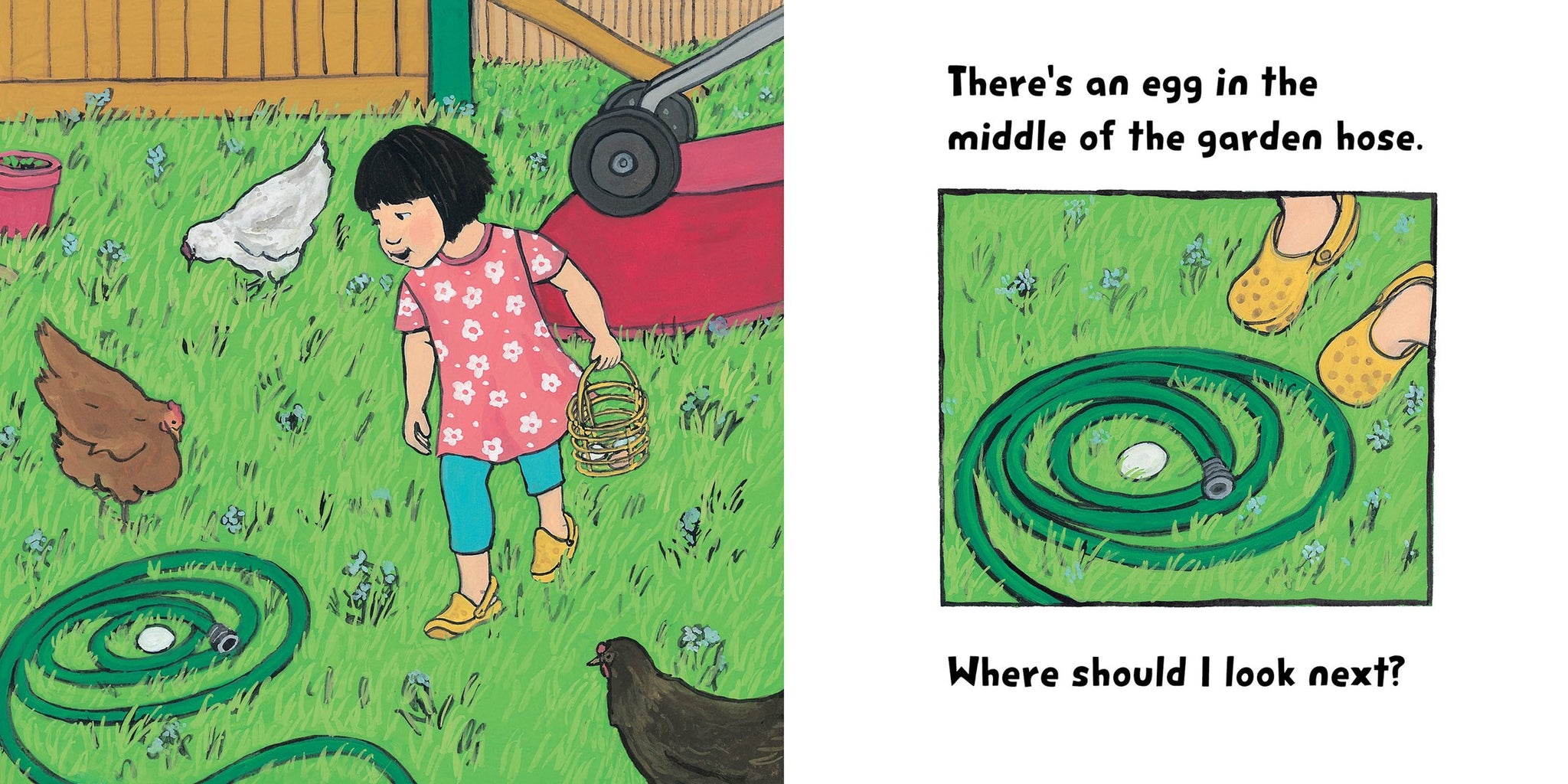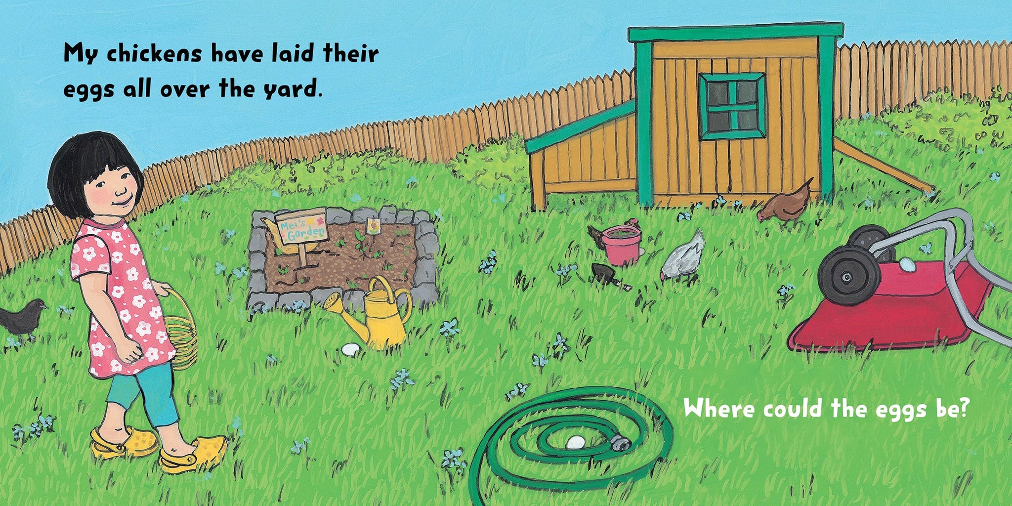 The chickens have laid their eggs all over the yard! Mei looks for the eggs, searching next to a watering can, behind a flower pot, inside a wheelbarrow . . . and under a chicken! Go on a springtime egghunt in this playful story about spatial sense.